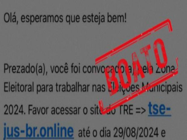 No corpo de ambos os e-mails, é exibido o seguinte texto: “Tribunal da Zona Eleitoral municipal. Convocação para trabalhar nas eleições”. Em seguida, é solicitado o acesso ao site falso “tse-jus-br2024.online” até o dia 29 de agosto para atualizaçãodos dados cadastrais e obtençãode mais informações sobre a suposta convocação.